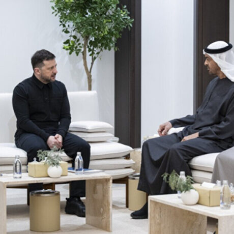 Президент України Володимир Зеленський під час зустрічі в Абу-Дабі з президентом Об'єднаних Арабських Еміратів Мухаммадом бін Заїдом Аль Нагаяном...